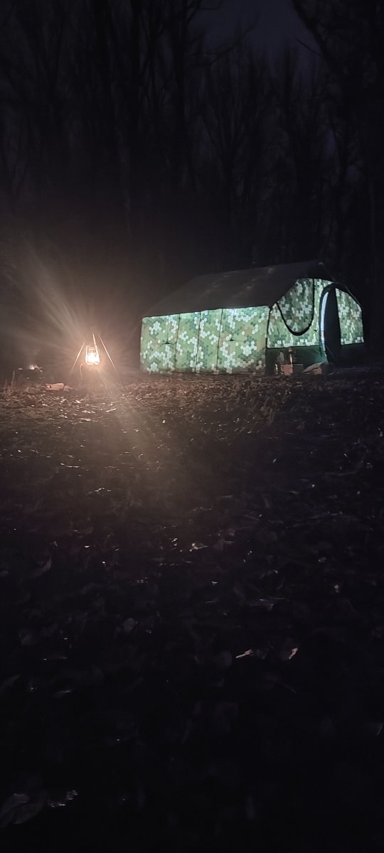 Всём привет. На крещение ставил р34 и мб22. 34 всегда ставили вдвоём с женой, в этот раз пришлось ставить одному. Первый раз попробовал ставить сначала внешний слой, а затем внутренний. Получилось очень быстро, из за того что получается поправлять изнутри, натянул его минут за 5-7. Очень ещё помогает центральная штанга которой очень удобно поправлять в самых верхних точках. Берёшь её вместо шесть и расправляешь если не дотягиваешся. Внутренний слой спокойно с дальней стороны палатки начинаешь пристегивать и все получается замечательно. Изн удобно одному натягивать так, привязываешь пару верёвок за кольца изн, перекидываешь через палатку и тянешь. Главное расправить его, на морозе жёсткий и если хорошо не расправить, складками цепляется и плохо идёт. Поставил весь лагерь один примерно минут за 30. Когда приехали жена и друзья, уже в палатках было в одной тепло, а в другой ад. Паробомба как всегда дала жару. Три раза парились и ныряли в прорубь и хорошо посидели. 7 часов пролетели незаметно.