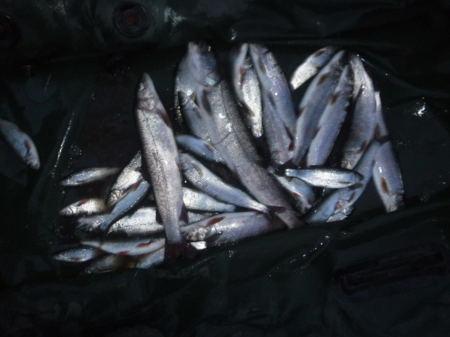 В этот крайний раз нас было пятеро. В дороге мне позвонил Бахыт - а это добрый знак, значит всё будет хорошо. Река на удивление пока не встала, на берегах уже давно никого нет, и мы используем все свободные выходные. Тем более начал скатываться вниз ленок, и мы успеваем забрать последние деньки жидкой воды и возможность отвести душу перед зимней спячкой. Парни шутят над моим дедовским спиннингом 25-летней давности (новый погиб на сплаве в этом году) и китайской катушкой за 400 рублей. Мне пофиг, я, как "хозяин жилья" больше в лагере на берегу, слежу за кухней, "домом" и теплом в нём. Я не взял никаких трофеев, хотя два раза дёргало так, что аж вспотел. А вот мужики, разбежавшись по берегам, отработали до темна нормально. Причём основной клёв был перед самой темнотой. Забереги плотные, заливчики стоят подо льдом, но сама река ещё чистая. Ельца мы не считаем за рыбу, но вперемешку с ленком получилось неплохо. На фото результат вечера второго дня.