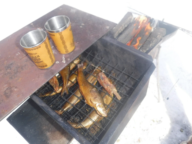 Затем нарыли под снегом сосновых шишек и за 15 минут закоптили хариуса, водрузив коптилку на Шикардос.