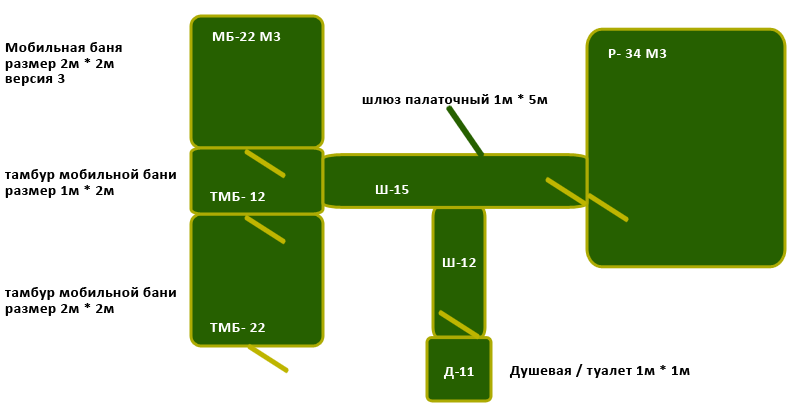 2. почему бы не делать палатку МБ-55, МБ-77 модульными? и докупаемыми. Взял МБ22М3, к ней пристегнул тамбур 1*2 м - получил полный аналог МБ332. К ней еще раз тамбур 2*2м - получил МБ552. К первому тамбуру в боковом крепеже пристегнул шлюз из пункта ниже и к нему Р-34М3 - получил треугольную Т-образную конструкцию с баней, спальней и кладовкой одновременно.