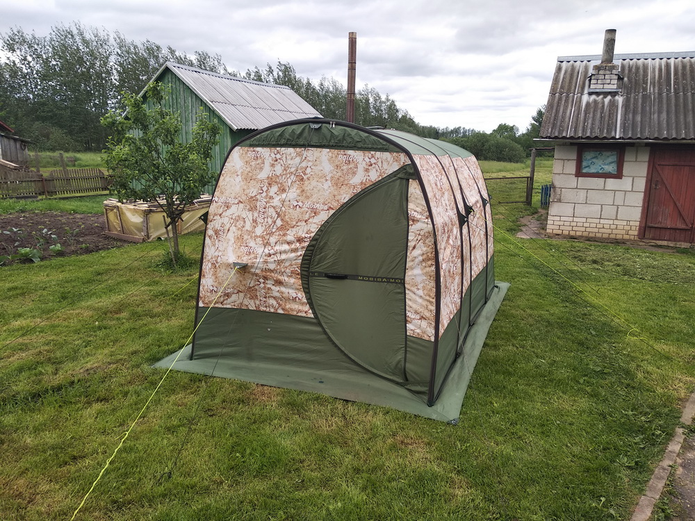 Итак во дворе у обожаемой тещи ставится 104ка. Место для нее привычное.В этот раз крепил её по углам колышками из арматуры 8мм и длиной 35 см., а остальные оттяжки колышками из арматуры 6 мм и длиной 20 см. Палатка выстояла по итогу в довольно сильный порывистый ветер.