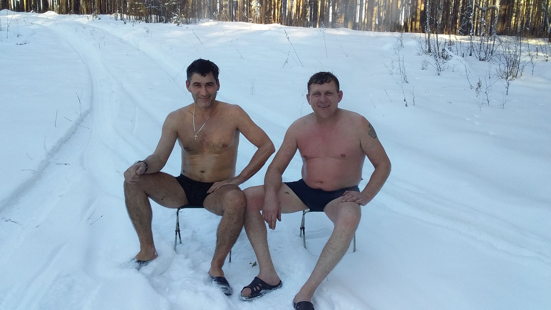 Парились допоздна, мы с товарищем с ночных смен, поэтому особо не усердствовали - зашли за всё время 4 раза. А вот женщины у нас разошлись. Подруга товарища очень любит баню, у них в доме хорошая стационарная, но в Мобибе парилась впервые. Сказала, что в этой парилке очень легко дышится, поэтому можно заходить много раз. Короче, мы сбились со счёту, сколько раз наши женщины парились и купались в снегу. Собирались по темноте, домой прибыли в 23.00.