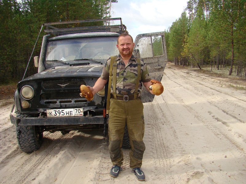 Наше решение «поспать пару часов до рассвета и двигать дальше», увы, разбивается о чугунный лоб овладевшей нами усталости, поэтому спим мы не два часа, а все полноценные пять, потом опять стартуем. Осталось 40 км, или, если более точно, чуть более двух часов. Здесь начинаются «угодья, вельми белым грибом богатые, а також медведями обильные», но, к сожалению, бедные людьми; раз в несколько дней здесь проходит лесовоз, а в сухой год (получается добраться) иногда можно встретить охотников, грибников, шишкарей или ягодников. Нынче год «мокрый», а потому – никого нет, грибы стоят нетронутые, а медведи – непуганые. Андрей, разумеется, мимо такого изобилия пройти не может, поэтому приходится иногда останавливаться на несколько минут, и, пока я курю, он успевает нарезать ведро-другое перестойного белого гриба. Все мои аргументы на тему «дряблый, не довезем!» разбиваются о стену непонимания: грибы же! Наконец мы добираемся до нужного нам места, того, где стоит машина. У меня отлегло от сердца: ни зверь, ни человек к машине не подходил, все стоит нетронутым, именно так, как я оставил. Машину, правда, снова стащило в грязь, но при наличии тягача – это мелочи жизни! Быстренько заводим трос и освобождаем мою «Нивку» из грязевого плена. Сразу же снимаем аккумулятор, достаем генератор и зарядник и ставим батарейку заряжаться. Теперь, пока генератор молотит, решаем съездить до лагеря и лабазов, посмотреть, что там творится. На лагере все так же, как мы с Мариной оставили, на лабазе – тоже, медведь не приходил, а это плохо. И какого черта я туда на горбу два ведра тухлой рыбы тащил-надрывался, а?! Хорошо, что фотографии запаха не передают; если бы передавали, то лайков к марининому посту, думаю я, было бы ощутимо меньше.