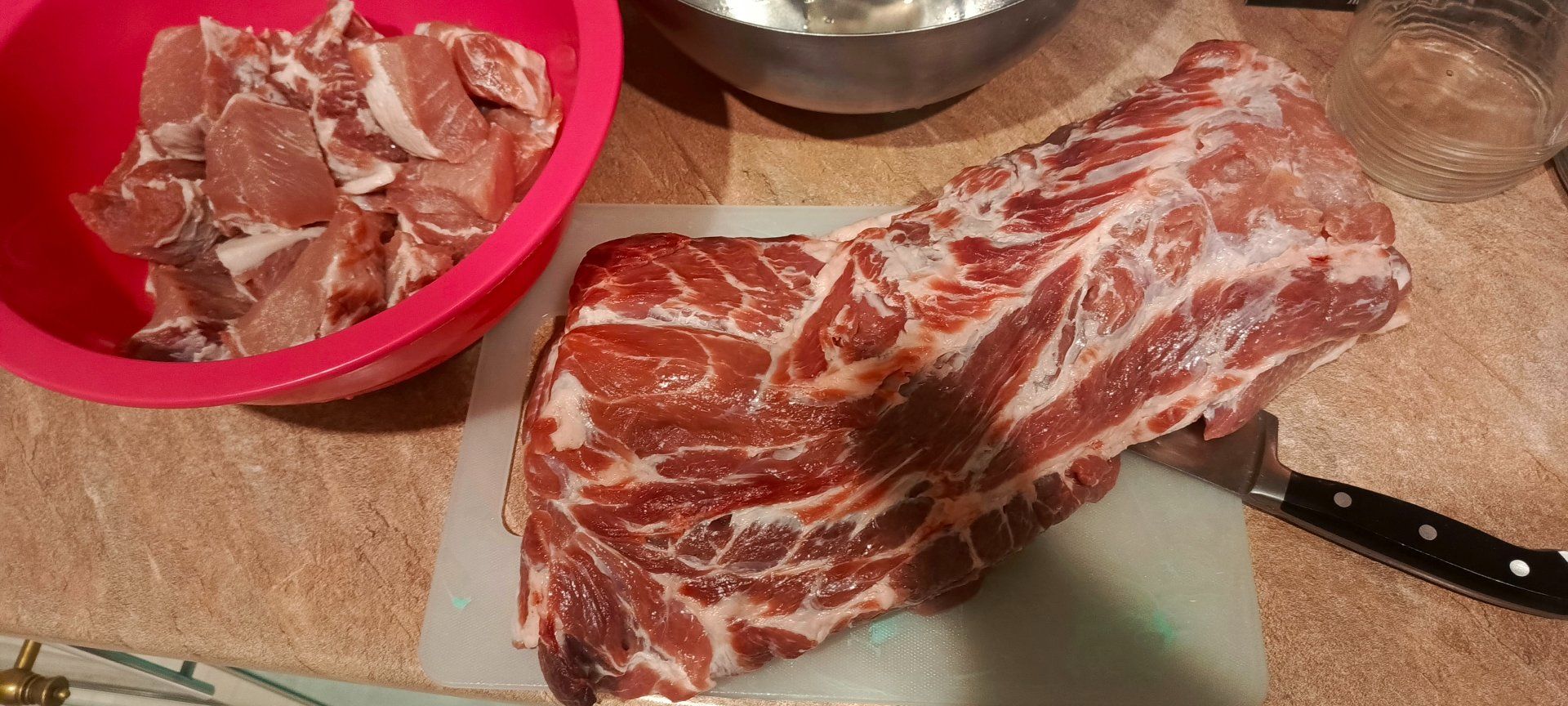 Нарезаю шею на шашлык как раз. Я обычно при случае беру побольше. Сейчас сразу все замариную. А завтра разложу все на партии в пакеты через вакууматор. И в морозилку. В вакууме шашлык долго лежать может уже готовый. При необходимости достается пакет или несколько, разморозил и на шампуры.