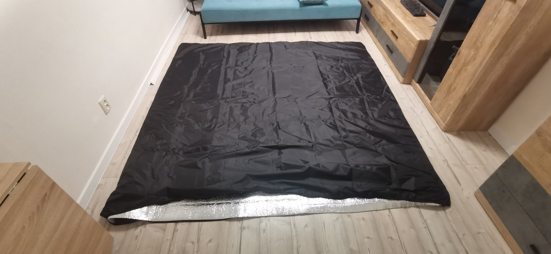 Скоро зима. Пора готовиться. Еще весной купил на озоне готовый пол-чехол 240х240 по приемлимой цене. Он оказался чуть меньше размером, но это не страшно. Двух слойный из оксфорда, закрывается на молнию. Качество приемлимое, сам сшил бы наверное хуже, не хватает наверное петелек по углам для колышек.