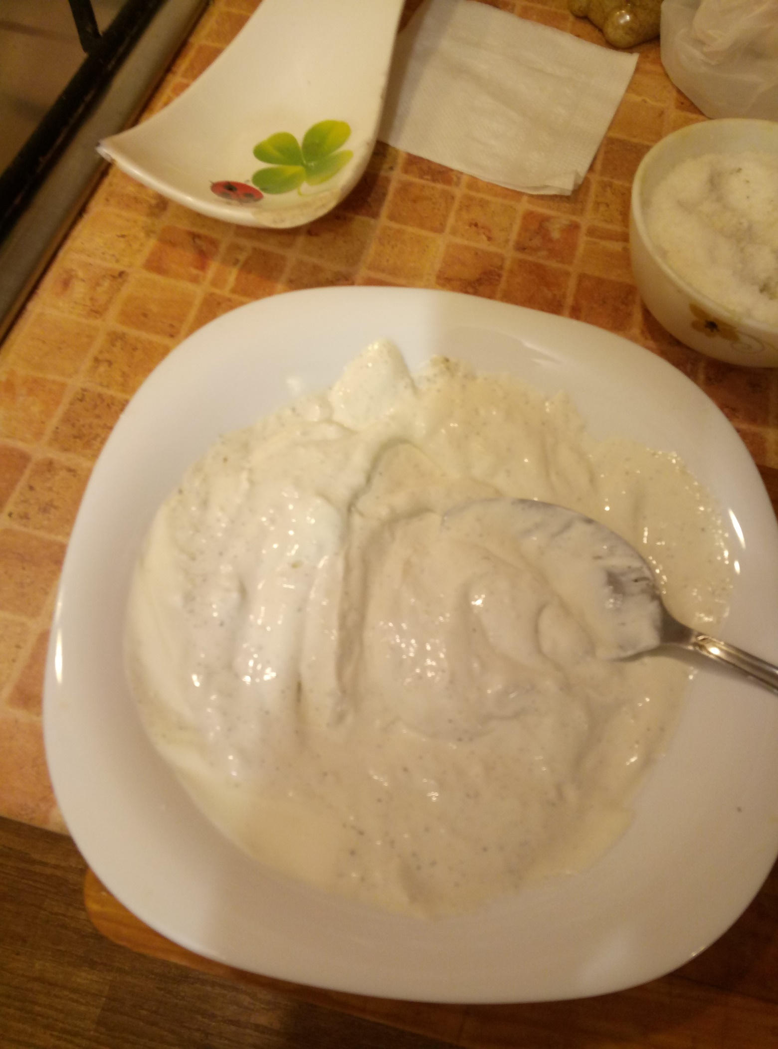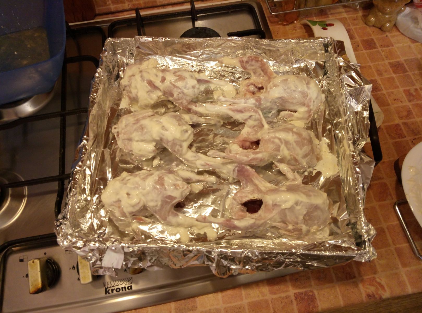 Сбразгиваем лимоном и солим, даём постоять полчасика. Пьём пиво и готовим соус. Смешиваем чеснок, сметану, солим и перчим. Тщательно и обильно обмазываем птичек. И в духовку на 40 минут при 180 градусах.