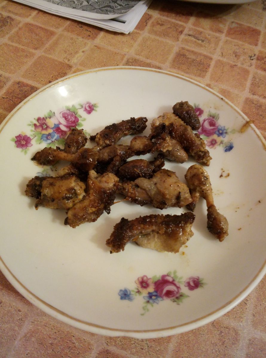 А еще попробовал жарить шашлык из маринованной грудинки с шампиньонами.