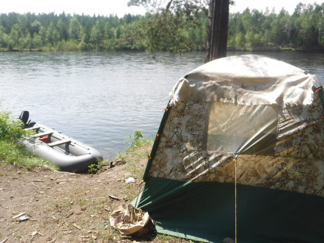 Здесь на рыбалке с мужиками: А это семейный выезд на Троицу со старыми друзьями. Забрались подальше, чтоб без соседей. Нас шестеро с младшими детьми. Белая ещё холодная, без бани никак, поэтому парились и купались весь день. Небольшой косяк - в РБ200 перетёрлась ручка двери, которая изнутри. Тут надо учитывать частоту использования палатки. За 2 с половиной года я ставил её минимум раз в десять дней, т.е. около сотни раз. Потом что-нибудь придумаю, а пока клапан двери легко решил проблему.