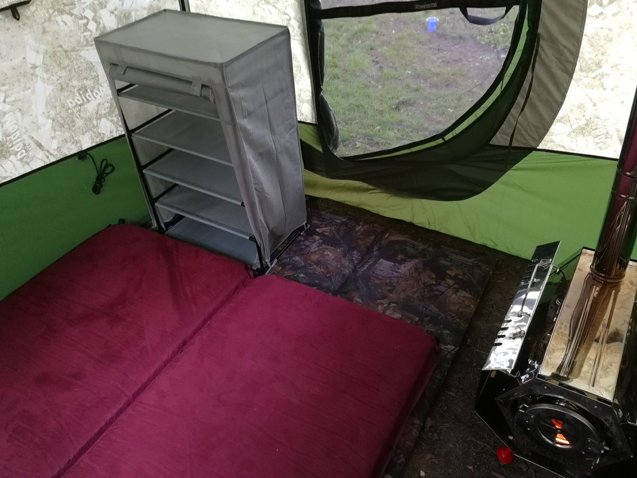 Использование внутреннего тента ТВ-15 в банном режиме... Возможно конечно, хоть и пристегивать его зимой к петлям - совсем не тоже самое, как "прощелкнуть" тент на замкнутом каркасе старшей серии, тут повозиться поболее придется. И опять же не отменяет либо отдельной теплой переодевалки, либо накидного предбанника, потому как пристыковать что-то к палатке конической формы, а не вагонной компоновки...