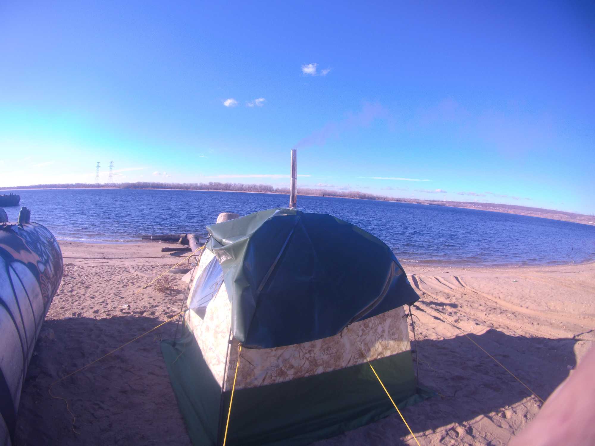 Погода не очень, солнце светит но сыро и холодно. Тем не менее я встал рано, потренировался и решил что я в любом случае поеду в баню. Своих не приглашал, решил поехать в одно интересное место. Летом там кишит людьми а вот сейчас никого. Вот и подумал сниму кино в бане попарюсь отдохну вобщем. Собрался поехал ..... по пути решил красивые места уже начать снимать. Креплю крепление камеры на боковое зеркало автомобиля .... лопается и разбивается зеркало(плохая приемета) ну приметы приметами а надо жить дальше. Креплю в другое место еду снимаю красоту. Мельком взглянул на приборы и понимаю что у авто нет зарядки. Просто великолепно, хорошо что увидел это в часе езды от города. Иначе бы назад сам уже не смог бы вернуться. Хорошо, вырубаем все потребители ползем домой. По дороге думаю, да хрен вам. Приезжаю перекидываю вещи в другую машину еду, но уже тупо к реке в черте города. Насрать думаю, все равно нужна баня. У реки страшный ветер, пофигу устанавливаю Кайфандру. Заряжаю жигу. Готовлю баню. Без всяких теплых палаток - так чисто на легке аскетично и побыстрому.