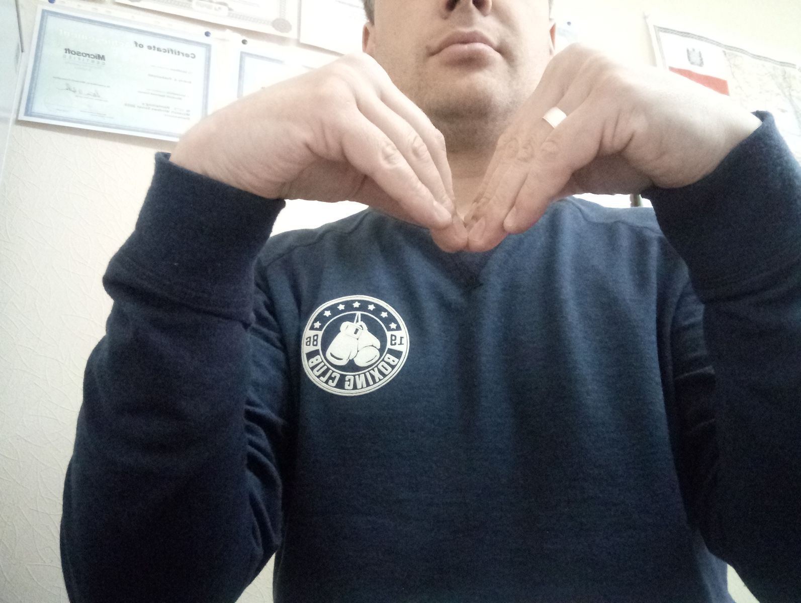 Ладони правой и левой рук перед грудью расположены параллельно земле. Представили? А теперь согнем пальцы таким образом, чтобы сами пальцы оставались прямыми и составили с ладонями угол в 90 градусов. Получаем: руки перед грудью, ладони параллельно земле, прямые пальцы направлены вниз вертикально. Теперь выгибаем запястья вверх, под углом примерно в 45 градусов таким образом, чтобы кончики прямых пальцев соединились. Получаем кисти, сложенные "домиком", а "крыши" "домиков" соприкасаются краями.