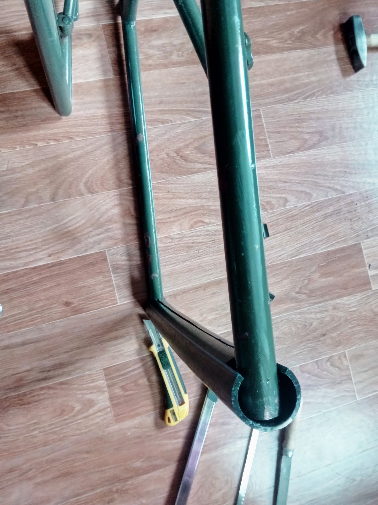 Все бы ничего, но ножки полока от Мобибы квадратные, плюсом еще мой удлинитель. Посему пришлось круглое оквадратить при помощи того же профиля, разогретого в топке Согры). В итоге получилось вот так. Тройники входят плотно и держаться крепко. Но я же купил еще кусок трубы! Зачем? Чисто теоретически - увеличивает площадь опоры.... Практически - подумал, а куда пихать эти тройники? Да так, чтоб потом вспомнить где они?