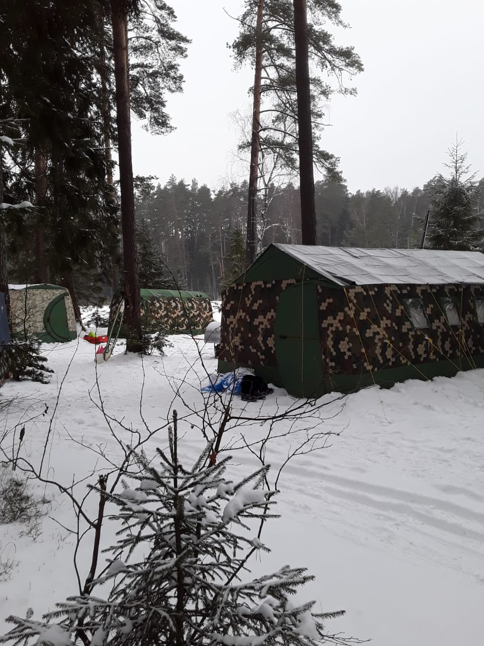 Решили мы своим близким попытаться сделать сказку на новый год(надоел нам медвепут) . Готовится начали с июня. Заказали и дрова(тонна пилетов) и развлечения (снегоходы гирлянды салюты ...)и двадцать девятого декабря рванули строить лагерь . За два дня всё наладили . В р63 был жилой модуль с двумя мега сограми. В 104 была баня на всю длину ,её прогревала медиана5 парафон 3 и паробомба (дома оставили вторую паробомбу так как многие любят поспать с парафоном на полках при медленной прожарки:) . Кухня была обустроена в 442 с мега согрой. Туалет в парнике(самоделка из полипропиленовых труб и плёнки) с согрой (пришол к тому что хочу мб22 под туалет ) и тут снимаю шляпу перед проектировщиками ! Не так легко оказывается сладить полатку под туалет:)))) ни кто не примёрз к био туалету и сам он не замёрз согра обогревала на 5 с плюсом! Была купель собственной сварки(она разборная) чашка пвх(два куба с озера прогрели часа за 4 до 40 гр . Печь самоделка из медной трубы. В р63 были переделаны раскладушки гринэл в двухярусные . Поэтому жили в два этажа. (На вопрос в выше постах отвечу точно не нужно опускать палатку. ) Кровати ооочень всем понравились . Пришол к выводу что стакими кроватями в 104 можно жить в 4 в месте с вещами и останется место под кухню в ней же. Палатка очень удобная, тёплая, светлая ,двери просто огонь(в зимних вещах очень тяжело ходить в маленькие двери ,а тут хоть на Санках залетай. Полы очень крутая вещь комфортно ходить босиком. Не боишься проживать момент когда дети сели народ так как понемаешь что они промёрзнут не раньше чем через часа два (если не двигаться вовсе) в общем и целом люди прожившие 12 дней в р63 (которые впервые спали зимой в палатке) а это 8 человек основного состава не смогли найти ни одного минуса в током жилье и проживание и всё спросили а поедим ли мы есчё и возьму ли я их с собой:)))