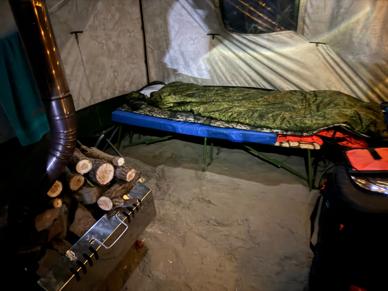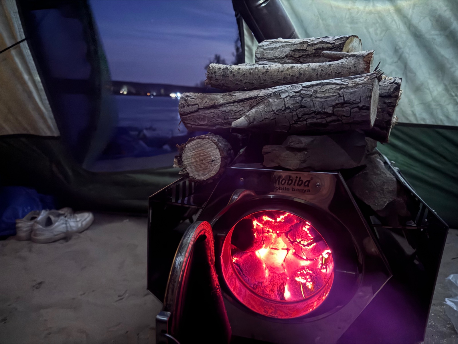 Всё стояло монументально (ещё бы, колышки из 8 арматуры длиной 40см.) несмотря на периодически возникающие порывы ветра (за время нашего прибывания был тайфун с дождём и сильным ветром). Когда ехали туда, нас все отговаривали, типа вас сдует и смоет, куда вы претесь (к слову сказать, летающие туалеты и тенты мы видели во время тайфуна). Кто-то туалеты ловит, а мы в это время в бане паримся, красота!!! КЦ-4 в 15ке без пола но с ИЗН вывозила и в ливень с ветром. Топили брикетами "Белый дым" местного производства из хвойных пород. RUFы я не нашёл в Приморье.
