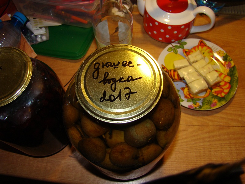 Технология проста. В вымытую трехлитровую банку насыпается "содержимое", примерно на половину объема. Половину можно определить эмпирическим путем, но здесь половина зависит от размера частиц продукта. Так, например, если это какая-нибудь мелкая ягода, типа кислицы/брусники/клюквы/черемухи и пр., то где-то до половины банки. Если это что-то более крупное, например, ранетка, яблоки-полукультурки, груша-дичка и пр., то практически вся банка, как на фото. Далее, по вкусу добавляем соль, перец, специи, лавровый лист (зачеркнуто) злые травы и коренья. Пропорции просты: полторашка водки на трехлитровую банку. Если лень возиться с вымериванием объема, то можно сделать наоборот: в банку с залитой полторашкой засыпается "Содержимое" до тех пор, пока уровень жидкости не достигнет горлышка. Затем банка закатывается крышкой. Плотно закатывается! Банка тщательно проверяется на герметичность, и даже не потому, что пары спирта летучи, и им свойственно испаряться со скоростью 9 молекулярных слоев в секунду, а потому, чтобы соблазна не было! Банка тщательно подписывается, тоже, как на фото. Чтобы, во-первых, самому в многочисленных компотах из тех же, за исключением водки, ингридиентов не запутаться, а во-вторых, чтобы ребенок не перепутал и не пристрастился "не к тому" раньше времени.