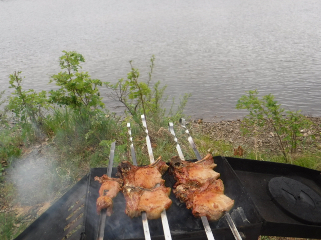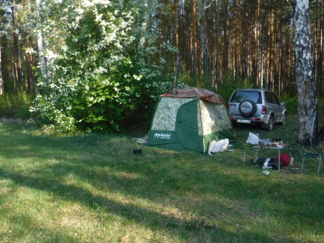 Знали, что в ночь будет дождь, вернее даже ливень по прогнозу. Взял допкрышу от 104-й. Подвязать второй слой на "попки" гораздо проще, чем на молнии у десятки. С установкой Согры пришлось немного поколдовать. Пробовали даже установить у левой стены от входа, но тогда подбрасывать в печь неудобно и большой ПСН-700 не встаёт. В итоге установили у фронтальной стены, но при этом сдвинув печь макимально возможно влево. Приличный наклон дымохода имеет место быть, но всё работает нормально. Из-за низкого потолка и меньшего объёма парилки Согра с жадеитом выдаёт в РБ-200 примерно столько, сколько Медиана в парилке МБ-104. Получается ещё один хороший универсальный комплект. При +6..+8 на улице, жару в парилке хватило нам с избытком. Думаю, зимой при утеплении пола тоже потянет. Напарились, накупались, затем вынесли полок. Умудрились установить в палатке с печкой столик и два пластиковых кресла. Только начали варить суп на Согре - пошёл дождик. К 23 часам он превратился в ливень, в полночь казалось, что на палатку кто-то льёт из огромного душа. Улеглись в час ночи и спали до 8 утра. В палатке было тепло и сухо. Тлеющего режима Согры при 3-4 градуса тепла на улице хватило с избытком. Дождь так и не прекратился, поэтому в 10 утра пришлось собирать наш скромный лагерёк. Теперь по расположению раскладушек и ночёвке. Две больших, типа "Медведя" точно с печью не войдут. Обычные кемпинговые с трудом. Дело в том, что ветровые оттяжки на стенах, в отличие от той же десятки расположены высоко и на уровне колена (высоты раскладушек) палатка практически не растягивается. Вариант - ПСН-700+раскладушка, как мы иногда практиковали в десятке, тоже не подходит из-за более покатых стенок палатки. А вот две подростковых 185х55 встали легко. Кусочек видео (фотик сел в самый неподходящий момент)