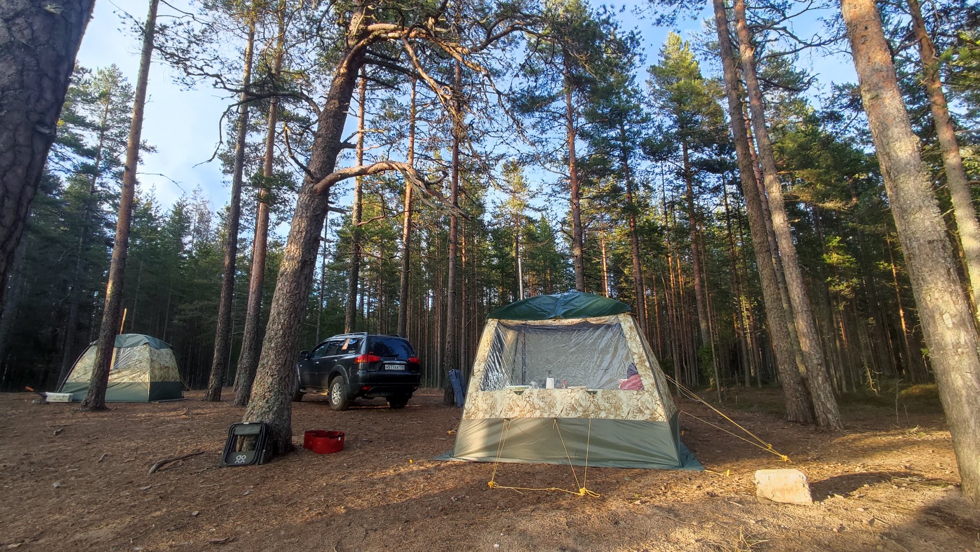 Ночью температура опускалась до 0, в палатке было +18, спалось шикарно. Следующий день – 9 мая, погода шикарная – солнце, относительно тепло +10. Мы стояли недалеко от р.Тулокса, здесь в годы ВОВ проходила Тулоксинская десантная операция. Прогулялись до памятного мемориала, почтили память. Потом неспешный пляжный отдых, баня и вкусный обедо-ужин с потрясающим видом. Переводим МБ-15 в режим спальни, меняем стол со стульями на раскладушки, завариваем чай на печке, играем в настолку «Ерундопель» и проваливаемся в сон. Утром экран МБ-15 показывает черно-белую версию «вида на миллион», сегодня пасмурно. Неспешно собираемся, решаем выехать пораньше, в планах заехать еще в пару месть посвященных ВОВ, да и дорога домой с учетом пробок будет долгой.