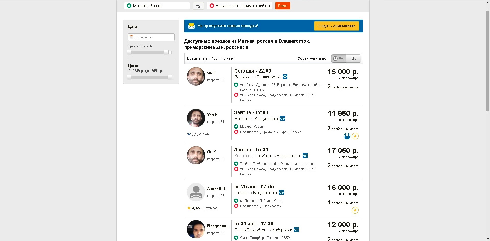 Набрал тут ради интересно на одном из сайте попутчиков, которым сам активно пользуюсь Москва - Владивосток.
