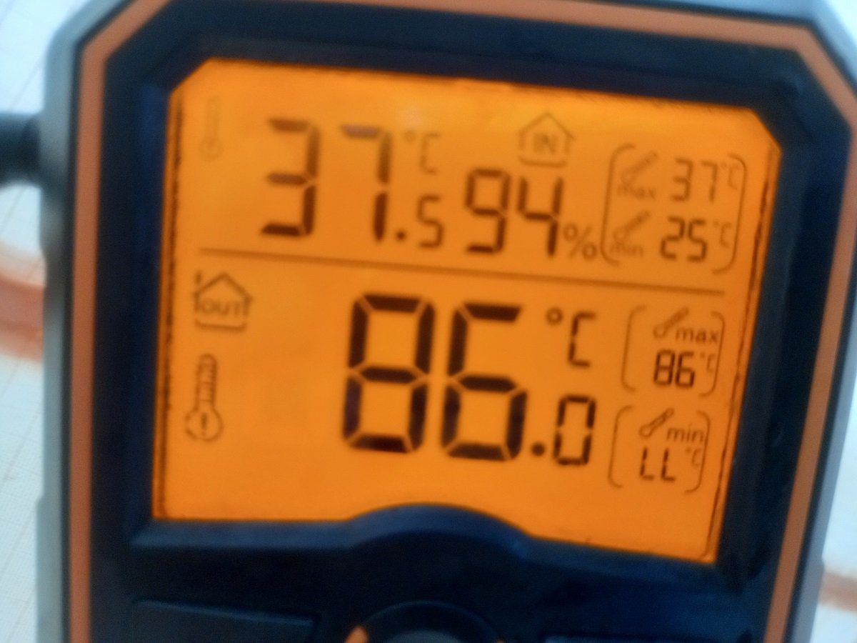 Отправил женщин на первый заход. Ожидания оправдались, тещи не было минут пятнадцать, хотя обычно она уже минут через пять-семь выходит. Спрашиваю - понравилось или как? Говорит понравилось и еще бы полежала, да Ира(супруга) изнервничалась - не баня, говорит, а херня какая-то. Уфф, значит их надо разными потоками разводить. Захожу в баню, реально пляж, по приборам на полоке 32*С/80%, на выносном 75*С. Подкинул еще три колотых, кипятка долил, жду. Пошлааа тепленькая) Сбегал за телефоном, чтобы цифры не перепутать при дальнейших наблюдениях
