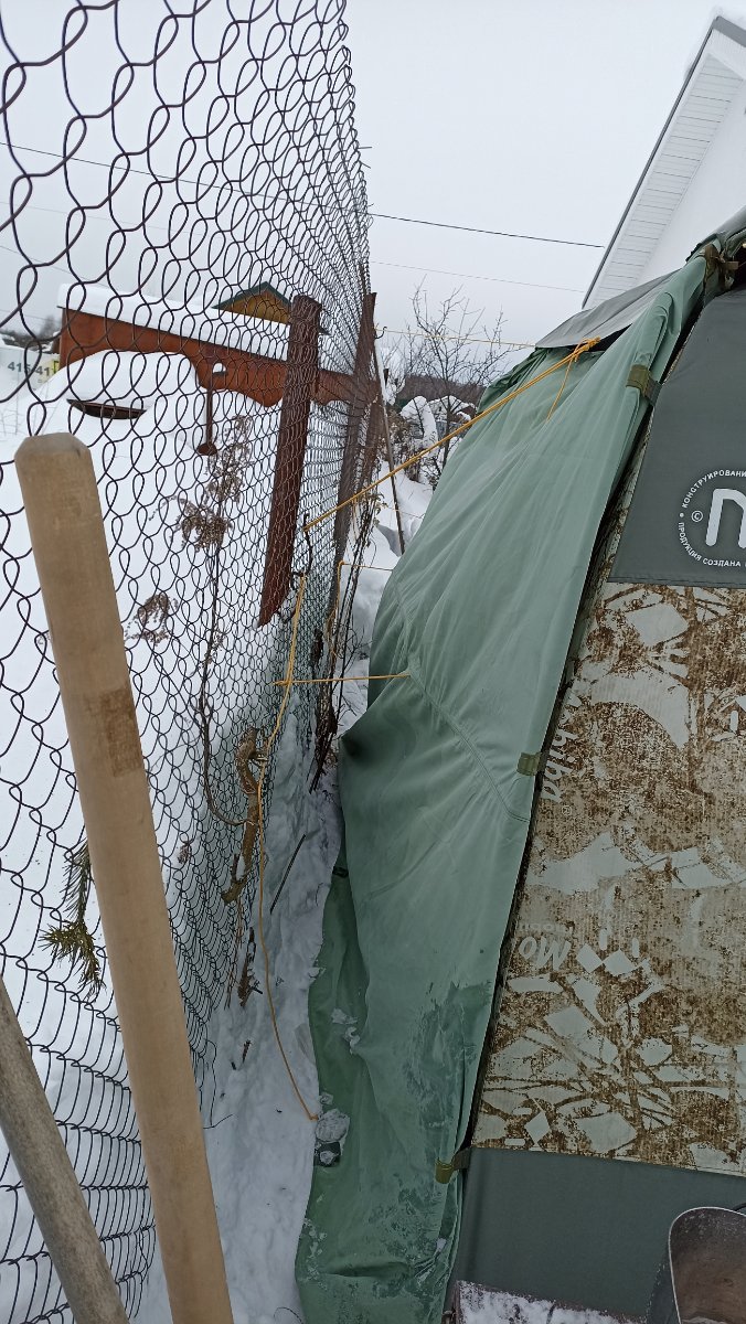 Слева зафиксировал пластиковыми крючками к каркасу, с правой стороны просто прорезал где крючки и зафиксировал вторым слоем сверху и тоже крючки на каркас. Верхнюю линию верёвкой через люверсы к каркасу подвязал, низ опустил ниже поддонов, на которых стоит баня, и присыпал снегом. Под оттяжки просто прорезал и вынул, хотя сейчас бы, прожёг окуратно дырочку и продел верёвки/оттяжки.