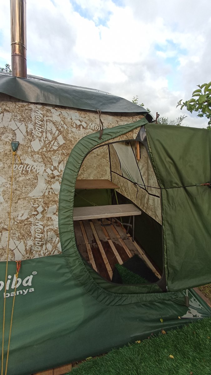 Вчера приехали вечером к детям на дом. Пока мангал готовил, установил РБ200/К5 с М8П4. Девчёнки в баню не пошли, сказали поздно, у них сериал и не охота после шашлыка, зять погреться сходил пару раз, днём на солнце обгорел слегка. Баня в одного. Хорошо. Прогрелся, пропарился, обливался водой из скважины, градусник показал 10 градусов, бодрит. На улице после 21 часа, +15, почти до полуночи парился. Топливо, первая закладка, 2 брикета, пару досочек и яблоня пиленая, потом уже дрова и обрезки досок, по немногу, зольник приоткрывал немного, в основном закрыт был, камни использовал, только когда хотелось повлажней пару. На полоке, 60 см, если сидеть, на уровне плеча 90-95 градусов при 35-40% влажности, по моему показометру. Поддача на камни выглядела примерно так, полил на камни, присел на пол, облако пара опустилось наполнив палатку, и с криком ух..... начинаешь работать веником.