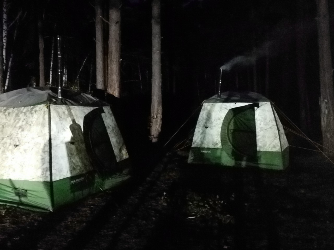 На мой взгляд палатки близко стоят, мало ли ветер поменяется и искры от одной печи могут прожечь боковую стенку другой.