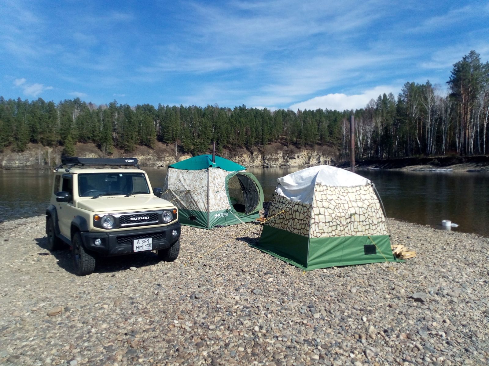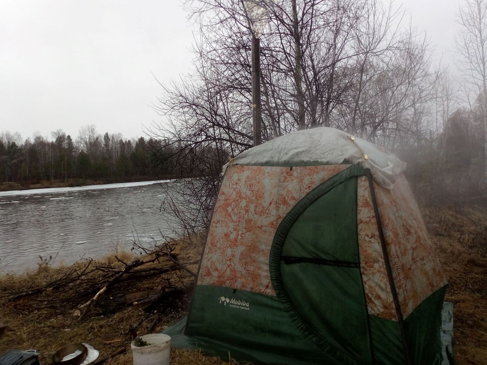 Белая вскрылась 9 дней назад, но льдины ещё плывут. Мы вдвоём с ближайшим товарищем. Алексей сталеварит сурово, поэтому КЦ-4 ставим в старенькую десятку, чтобы не было никаких вопросов. Взял под баню именно МБ-10, а не Кайфандру. Лишние 20 см высоты при парении вениками на полке ПС-750 совсем не лишние. Жильё МБ-15. В гараже перед выездом почесал репу, какую печь брать для ночёвки - МегаСогру или Дюну-3, ведь по ночам у нас ещё лёгкий минус. В старом трёхдвером джипе места немного, поэтому останавливаемся на Дюне-3. Можно сказать, что в последствии она справилась с отоплением не маленькой пятнашки. Спали в спальниках на раскладушках. Дюночку взбодрил в 4 утра.