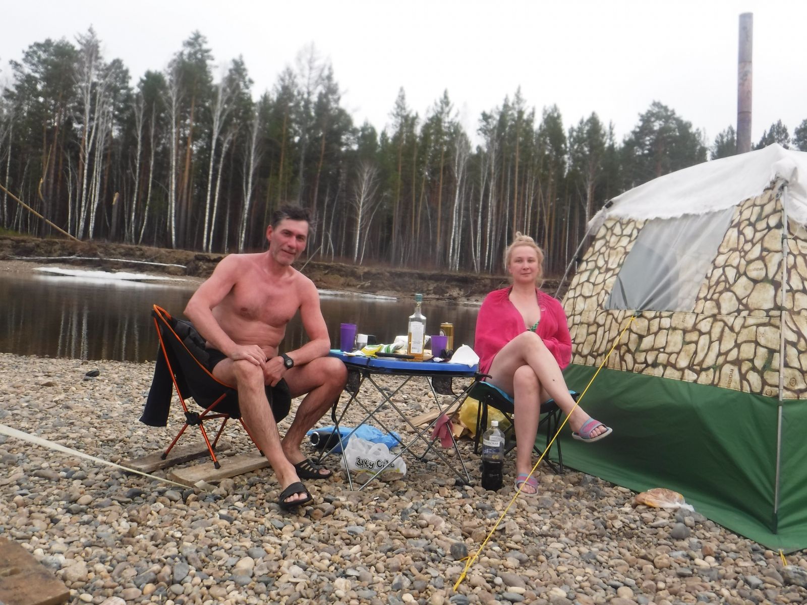 Только затопил баню - тут же пошёл дождик, и по реке сразу поплыли льдины. Сделали несколько качественных заходов в баньку.