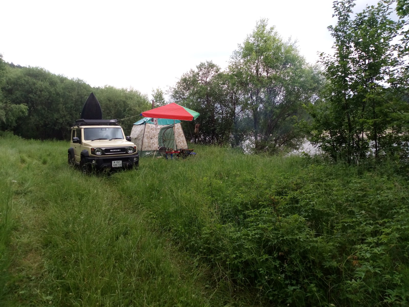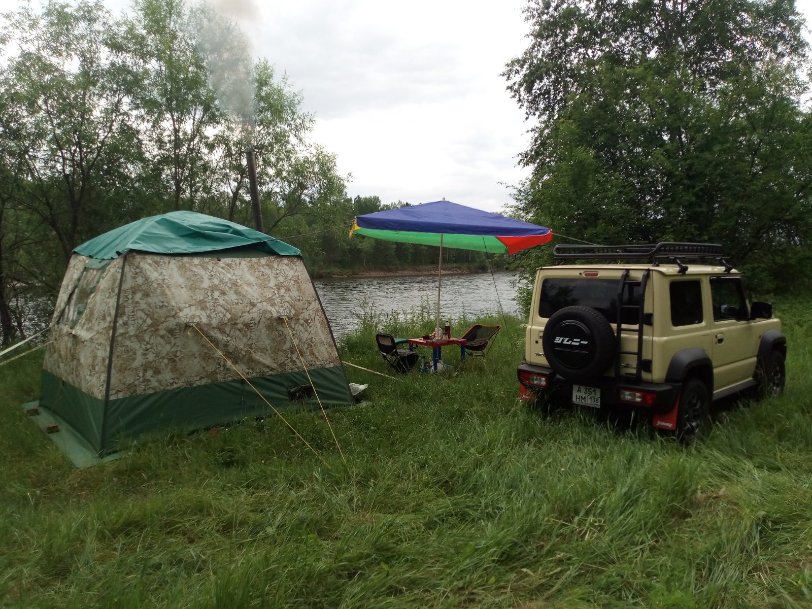 Дважды в неделю выгуливаю Джимника на реку. Мобибо-комплекты беру разные, в зависимости от условий. В этот раз обещали грозу и ливневый дождь, поэтому поехали с К5 и накидным тентом на неё. Печь Дюночка. Не прогадали. После жаркого дня загремела гроза и с неба полилось, как из душа. Зонт промок за час, и после бани мы переместились в тамбур К5.
