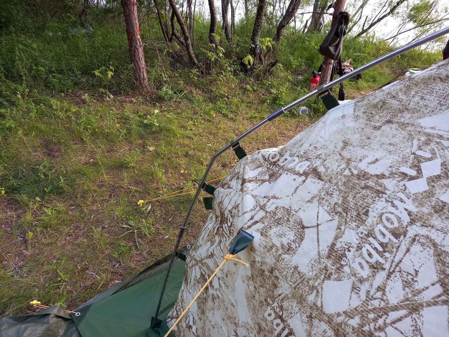 Выезжали в эти выходные с К-6 без печки,просто места не хватило в лодке,ночи тёплые,плюс 12-13,заодно проверили. Раньше до плюс 5 ездили без печки и ничего. Сейчас время комаров и мошки. Тут сразу вопросы по двери возникли,на не ровной поверхности есть перекос у двери и в эту щель комары проникают с удовольствием. Можно перенести или добавить петли под растяжки под козырёк двери и по углам палатки где сгиб каркаса,фото прилагаю. Ветер дул постоянно с реки,даже когда менялся,за палаткой лес. Можно ещё петли под растяжки на углах поднять. Ещё может увеличить высоту клапана двери с внутренней и наружной стороны сантиметров на пять.