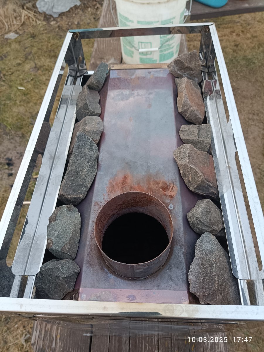 Предварительная примерка, вошло 20 кг камней, понятно что укладывать буду более плотно и не сегодня ставить печь в баню, но просто не удержался. :D