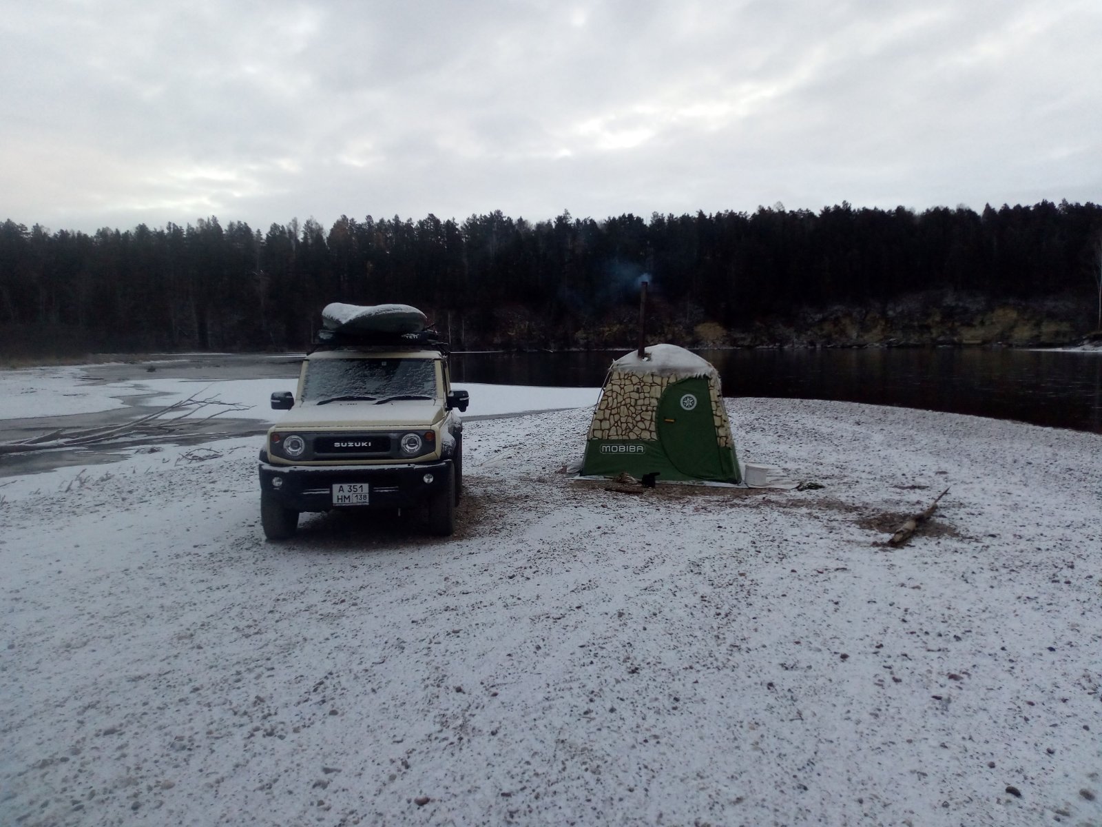 Закончил работу в обед, на следующий день выходной. Надо успевать. Наспех собрался в гараже, взял тёплый пол, но забыл очень важную вещь - тент к Кайфандре. Выяснилось это уже на берегу в 56 км от дома (место Кекурки).