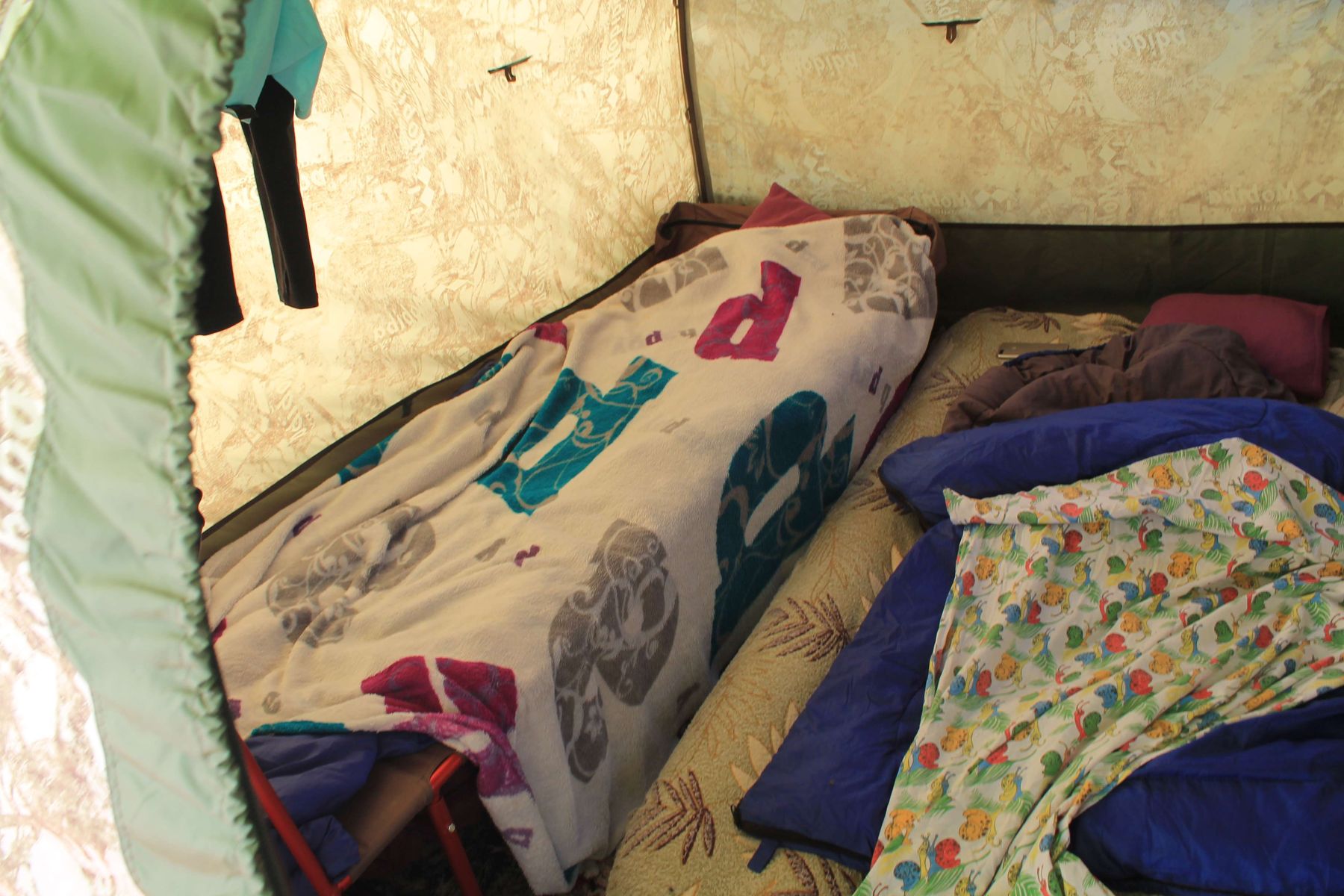 Сама ткань палатки и крыши достаточно хорошо пропускает инфракрасную часть спектра, причем двухслойность помогает, но недостаточно. А потом мы перестали вые*ваться и форсить новенькой палаткой, накинули сверху тент 6х4 из синего тарпаулина, и вот оно счастье! Можно просыпаться когда захочешь, а не когда тебя солнышко позовет