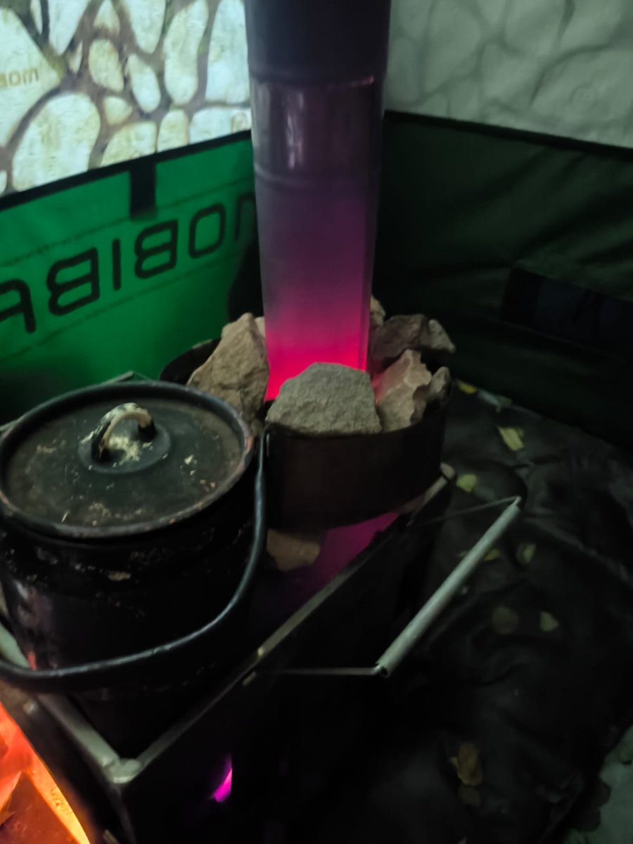 Сегодня была баня,давно я не делал суховоздушку,К5 с Дюна-3 с камнями,да,ещё и бак для воды поставил,но дело привычки,пользования печами с парогенерацией взяло верх,и бак,был налит на половину,крышка иногда висела просто на цепочки,труба внутри,выше воды краснющая,почти добился чего хотел,80+- температура и влажность 35-40 до 50-55,на пике,с поддачей на камни. К5 в один слой,тентом укрыта крыша и одна стена,где стоит ПСН,высота от земли 600. На улице минус 5. Пол не утеплён, изначально предпологал что будет первая баня на участке,на поддонах,но проезжая мост,посмотрел на речку и решили ставить на берегу и окунаться в р.Линду,потому, прямо на песке получилось,и казалось что не хватит жару,но всё получилось. Будем ждать парафон-4,сверим показания,пол главное не забыть взять,и что бы речка не замёрзла.