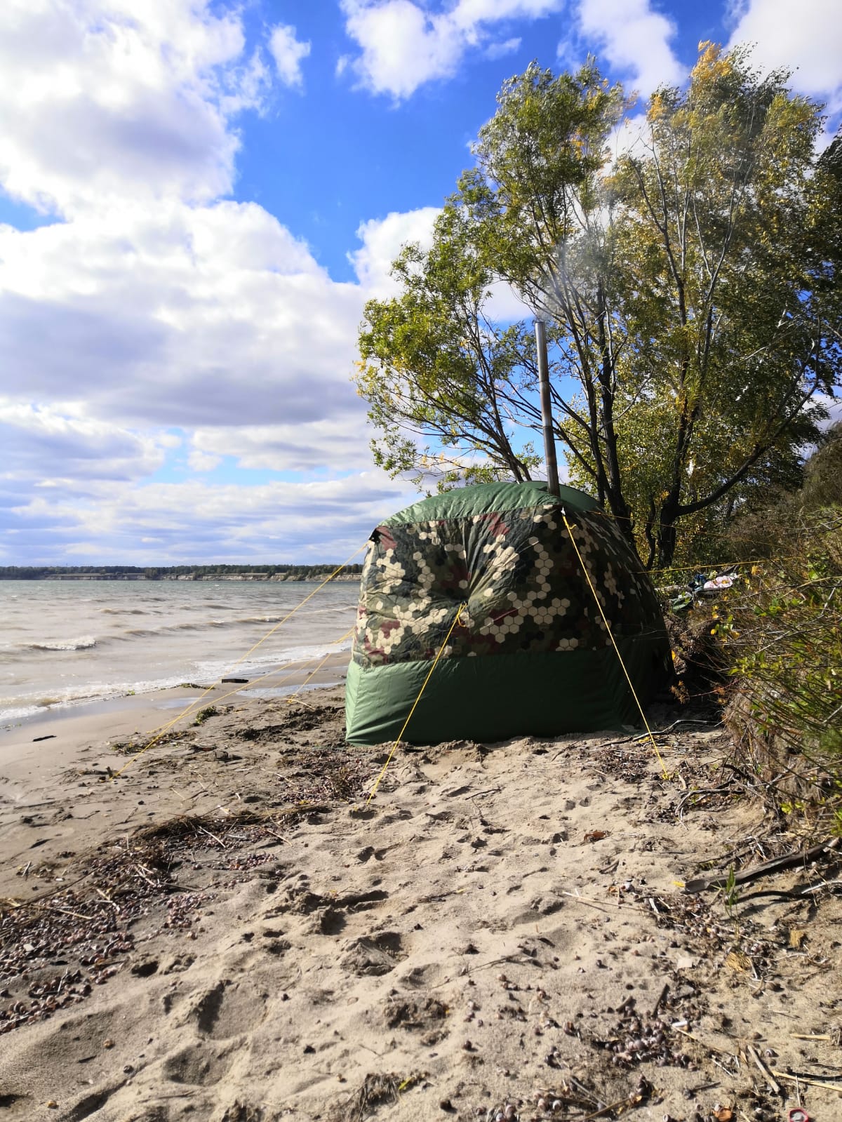 В ветреную погоду тент очень выручает, есть место где переодеться и погреться.