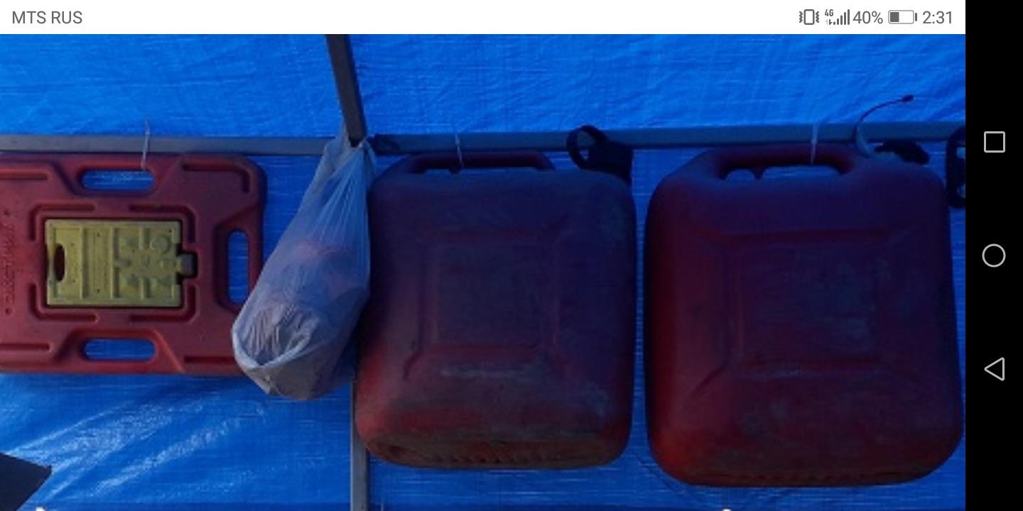 Леш, это - пустые канистры, по крайней мере - двадцатки. Дело здесь вот в чем. На данный поход запасал 240 л топлива. Много? Да. Но шли мы в этот раз на новом моторе (тоже "десятке", но уже двухтактной), а сколько он жрет в условиях движения на весьма тяжелом (для маломерного) судне в режиме водоизмещения - вопрос. 240 литров это 12 канистр, имеющих кучу плюсов, но всего один минус: они занимают драгоценное место на палубе. Потому по мере расходования пустые канистры подвешивались на каркас, где они не мешают.doxtor02 писал(а):Палыч, это что?По одной стяжке на каждую 20 л. канистру?