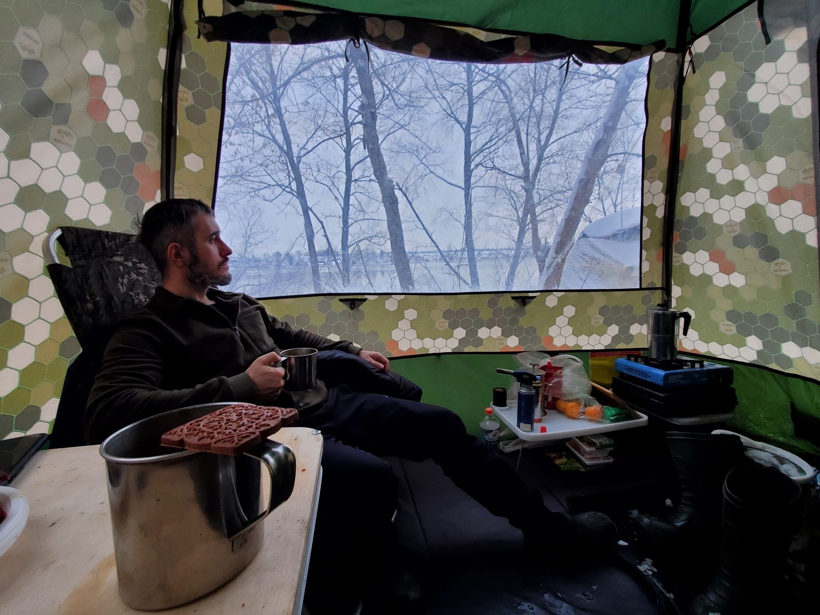 11 брикетов и в сон... Просыпался пару раз и приоткрывал подачу. В итоге до 8 оо комфортно спалось на раскривушке,ночью правда ветер был,палатку тормошил.Для себя сделал вывод что до -10 можно и с одним слоем комфортно бай