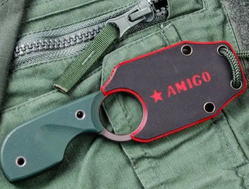 4. Кизляровский шейник Amigo. Мой любимец. Висит на шее. 95 % всего Что требуется от ножа выполняется им, несмотря на микроразмеры. Указательный палец продевается в кольцо. Из ножен выдёргивпется одним движением, сам не вываливается никогда. Особенно удобен раз рыбалке.
