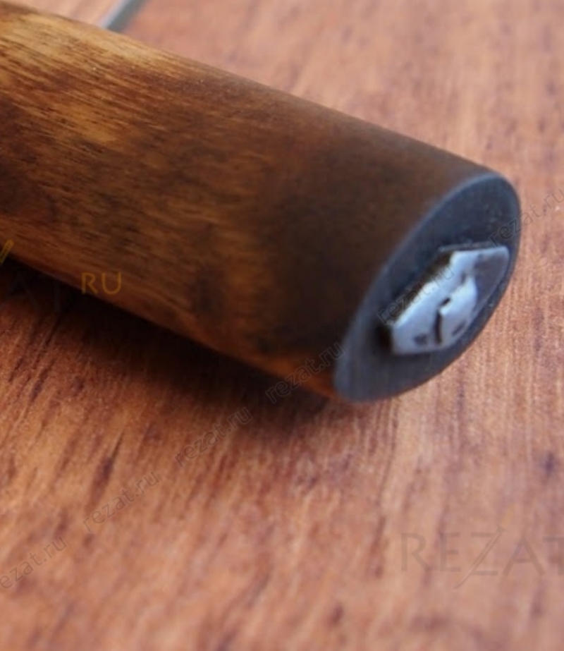 Толщина обуха клинка - 3.8 мм. Заточка - очень тупоугольная, бритвенной остроты добиться сложно, для тонких работ использовать не очень удобно. Сталь пакетная ,трёхслойная, видимо а этом залог прочности.