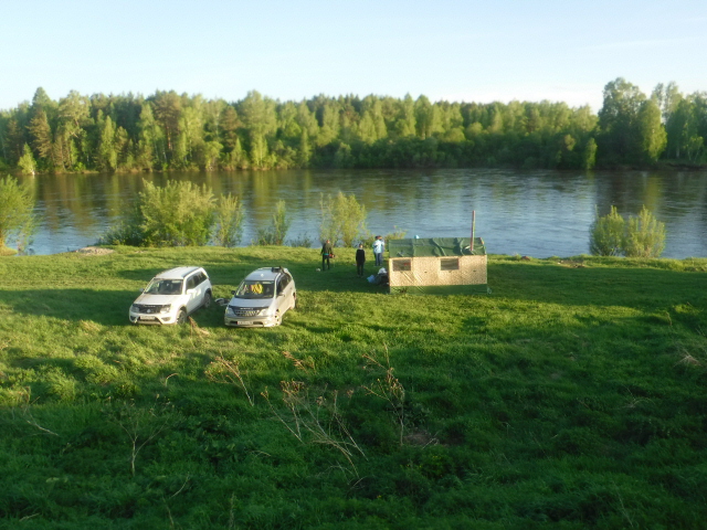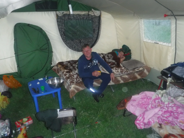 Р-436 в деле. Семейный выезд на реку с двумя ночёвками на двух авто. Всё раскисло от постоянных дождей, грязь месить не хотелось, да и ровные поляны для большой палатки на берегах нашей Белой найти не просто, поэтому встали под деревней Тюмень. Установили палатку за полчаса. Саня Петрович, извини, забыл сделать фото каркаса. Дети так увлеклись цеплянием крючков внутреннего купола, что пока я доставал фотоаппарат, они его уже установили. Следующий раз сделаю обязательно.