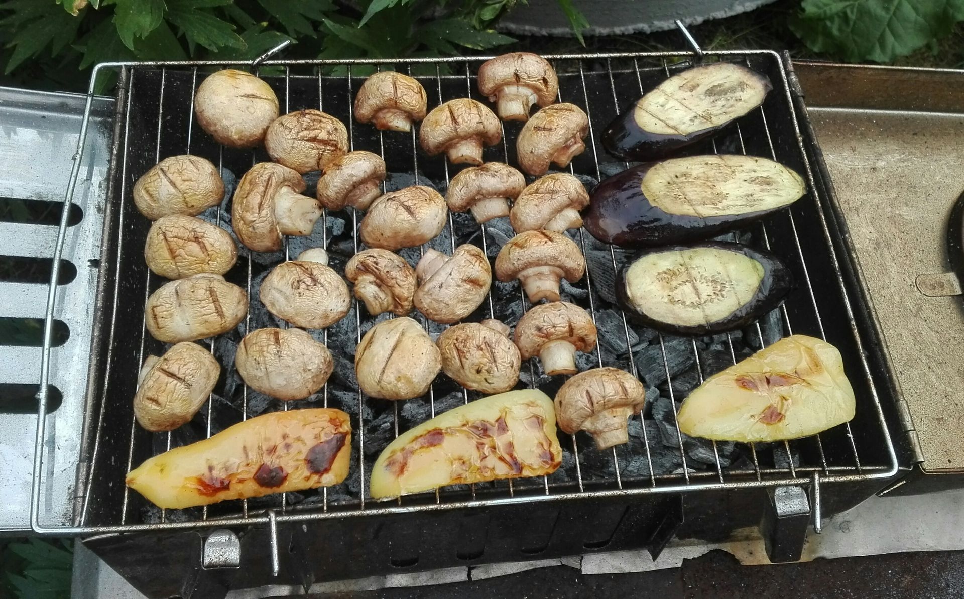 Просили баклажаны, пожалуйста. Ну и шампиньоны ещё, и перцев немного, мяско само собой. На последок хлеб подрумянить до хрустящей корочки.