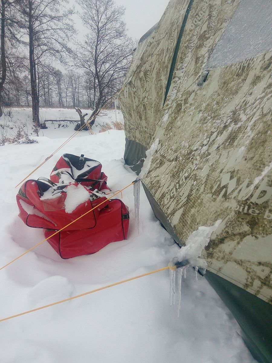 Постелили на пол утеплитель, на него рекламный баннер. Занесли и установили мебель, печки. Можно затапливать. Тут выясняется, что баннер постелили скользкой стороной вверх. Скользко так, что на сухом полу можно упасть. Выносим обратно мебель, печки, перестилаем пол. Старший сын мне говорит, что с прорубью не справился: все вроде пропилено, но льдина не тонет. Пока отреагировал, цепь бензопилы замерзла, схватилась льдом и не прокручивается. Ищем ключ с отверткой, чтобы разобрать пилу – нет нигде. Когда готовили пилу, цепь натягивали, в суматохе куда-то бросили, не найти. Нашли газовый баллончик, разогрели – оттаяла. Допилил прорубь. Но метр на метр – не наш размер. Сыну захотелось сальтом в прорубь нырять, и он сам допиливал ее до королевских размеров. Пропилил тоже не сразу. Цепь у пилы слетела. Одному из гостей пришлось топать к машине на шоссе за инструментами. Короче, лагерь устанавливался сумбурно. Но когда много народу, все равно весело.