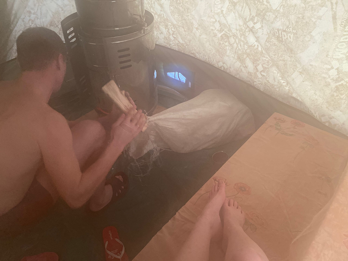 В прошлые выходные выезд был совмещен со съемками сюжета для региональной телекомпании. Изначально соглашался на съёмки только при условии, что корреспондент принимает непосредственное участие в процессе.) Внутри бани после закипания камера сразу запотела, и чтобы не угробить её, Юля (корреспондент) снимала на свою половину яблока. Несколько раз телефон сообщал о перегреве и просил переместиться в более прохладное место. Оператора же никто не предупредил, что можно будет попариться, оказался не готовым.) Было его даже жалко поначалу, приехал в ботинках, а снегу по колено, видно было что мерзнет сильно, потом отогрелся в тамбуре. Получилось не совсем так, как я это видел, в конце про здоровье приврали, но в целом вроде нормально.