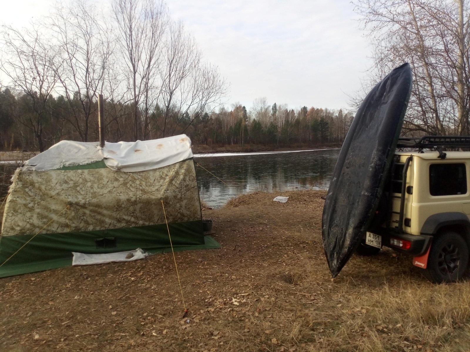 Пакрафт пришлось оттаивать ото льда так. Он 3,5 метра, а тент к К5 3 метра. А в пятнашку я его запихивал по диагонали.