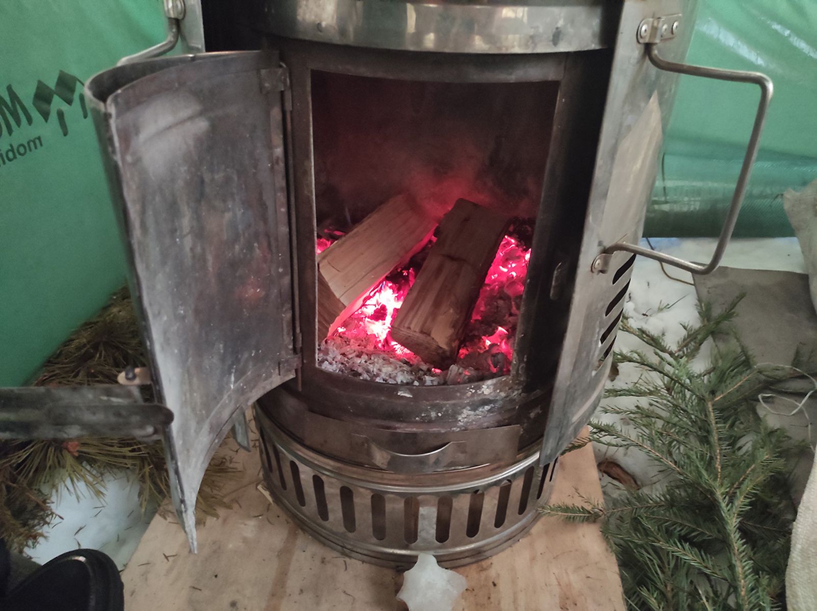 Ну да ладно. Вчера было +2+5, и выезд этот планировала супруга, пыталась друзей позвать, те отказались по разным причинам. Выехали вчетвером на уже привычное место, ввиду сырого снега спускаться к воде не решился, подниматься потом с прицепом тот еще секас, встали у леса. Никак не приучу себя брать на выезд лопату, снег пришлось ногами раскидывать. Во время установки успели поиграть в снежки, слепить полснеговика, покататься с горки, потом дети вообще свинтили на лыжах в лес фотографироваться. Но через полтора часа после приезда мы с женой уже начали париться, дети позже подтянулись. Это первый раз, когда Паробомбы было слишком много.
