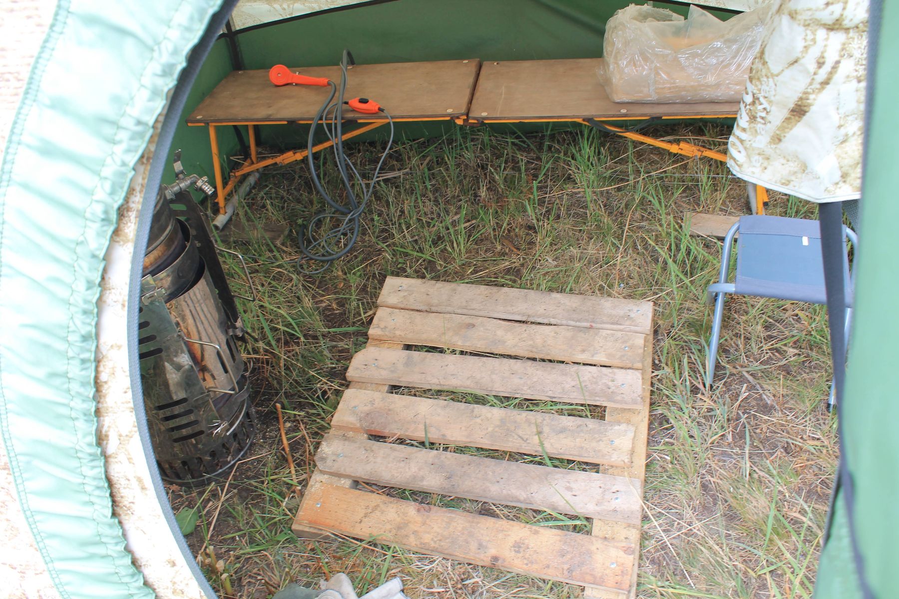 Кстати, зная, что стоять придется исключительно на песке, взял с собой 8 дощечек от разобранного поддона, отшлифованные наждачкой с одной стороны , длиной в сложенный ПСН-350 и 12 саморезов. По итогу получилась решетка, надежно отсекающая от песка. И ни одной занозы в пятках