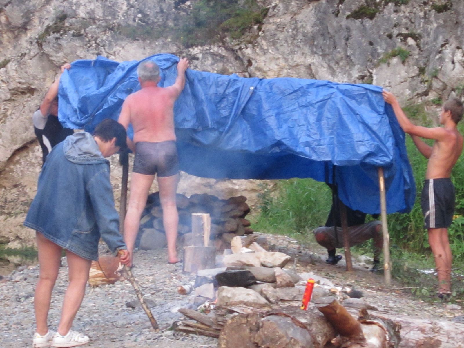 Все участники экспедиции таскали дрова, собирая их в радиусе километра, таскали камни с реки, чтобы сделать из них сооружение (горку) доходящую до пояса. На это уходило в среднем около двух часов. Затем обкладывали горку камней сначала мелкими щепками, потом дровами посерьезнее и наконец здоровенными бревнами. После зажигали пионерский костер и ждали пока камни раскалятся докрасна, в среднем "топили" 3 часа. Затем убирали остатки дров, проливали по кругу землю, дабы не обжечь ноги и ставили сверху шатер. После всех этих "танцев с бубнами" шли парится. Парились как индейцы, приплясывая вокруг раскаленных камней изредка поливая на них водой. Как мы не берегли пар и камни, через 30 минут шоу заканчивалось. Самые смелые еще успевали сбегать и окунуться в холодной горной реке.