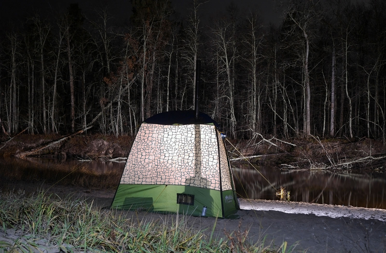 Около полуночи выгрузились на берегу, при свете фар и фонарей поставили жилую палатку (МБ-15+ТН-15), склад (МБ-10), отпустили машину, перекусили и спать. Всю ночь моросило, но это нисколько не испортило нам настроения на утро. На завтрак Леха долго и вдумчиво резал малосольную форель, мазал хлеб сливочным маслом, и никто его никуда не торопил...