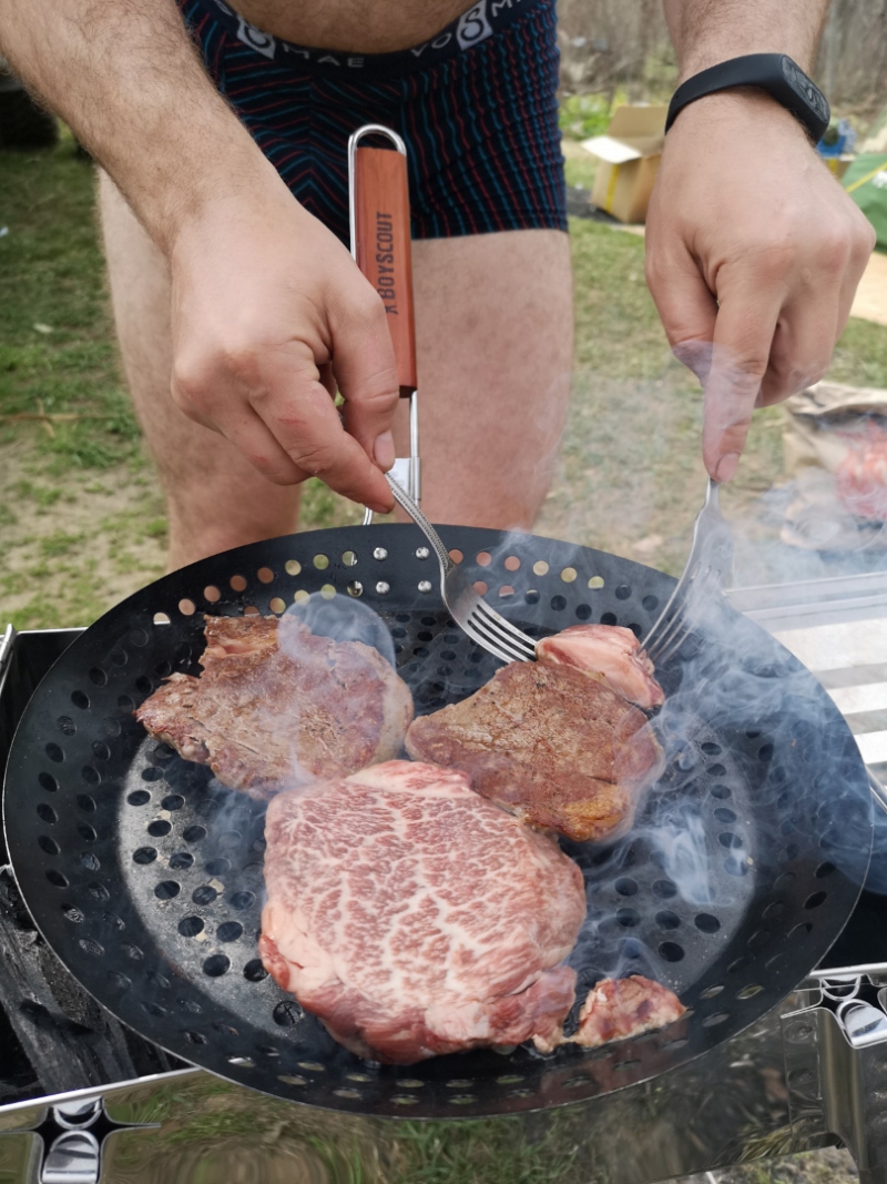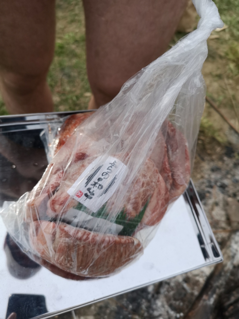 Вручение Шикардоса Серёге происходило на выходе из парилки по старинной японской традиции. Почему по японской? Потому что решили его обновить мы аутентичными японскими говяжьими стейками. Ням. К стейкам подавалась свежесобранная в сопках черемша. Ням два раза.