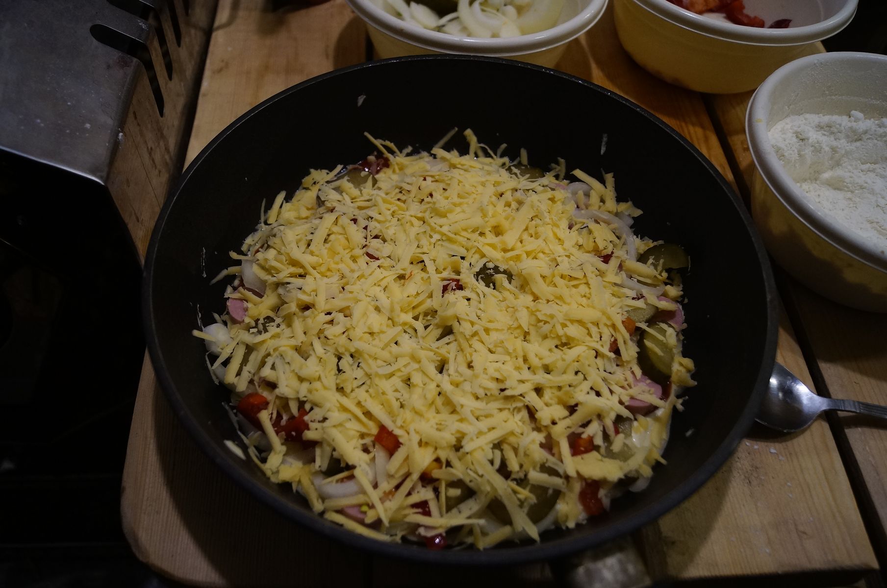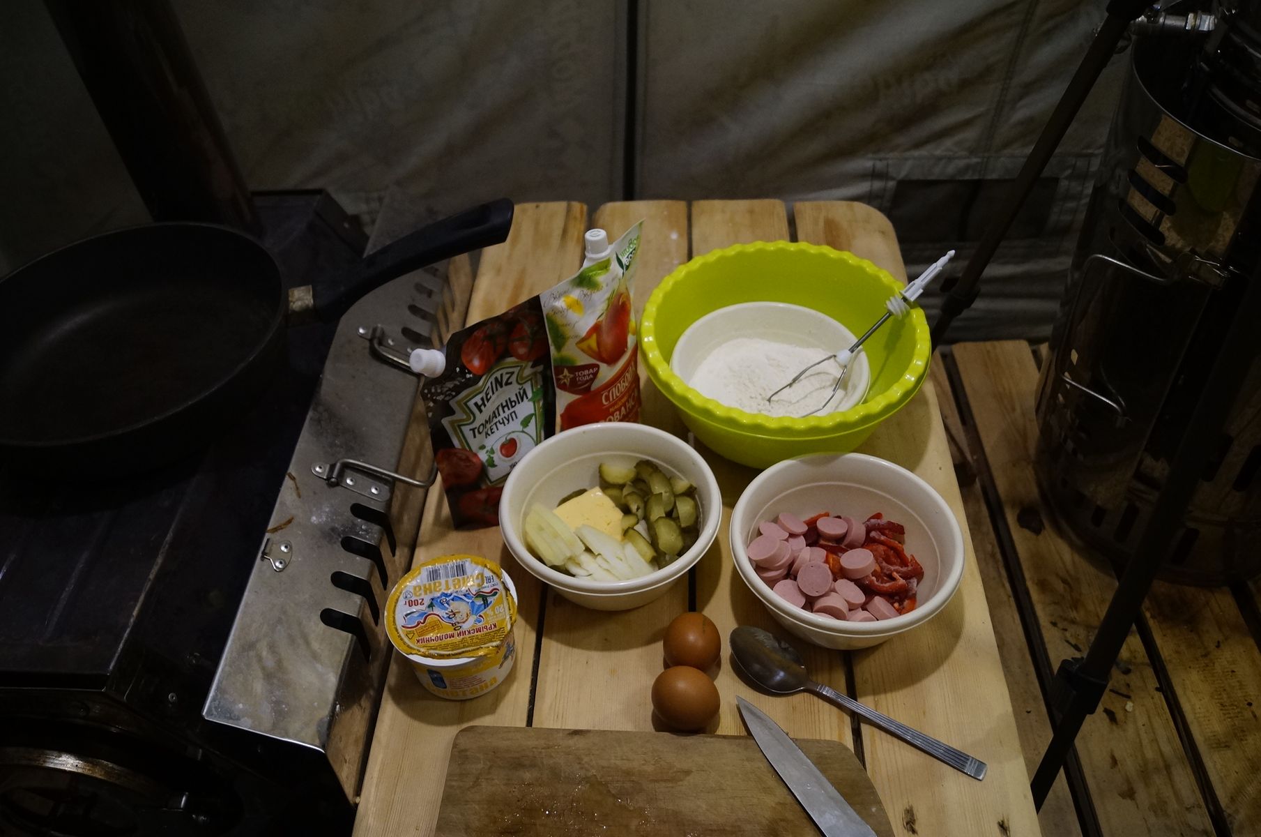 - для теста майонез (3 ложки), сметана (4 ложки), 2 яйца и мука (9 ложек)